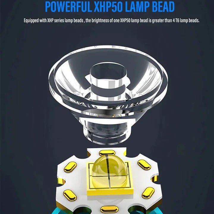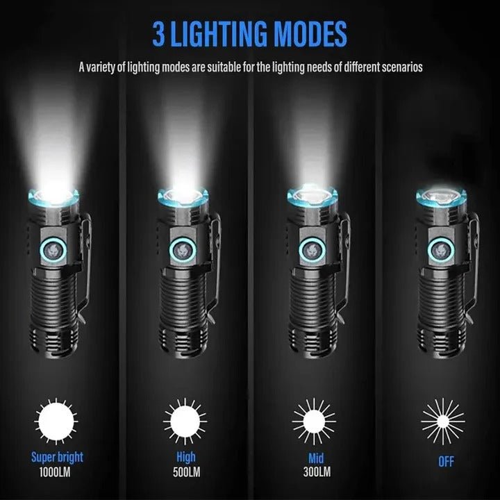 The flashlight operates using a rechargeable lithium battery and charges through a USB Type-C port. A battery indicator is included to display remaining charge. Charging time and runtime vary based on usage and power settings.