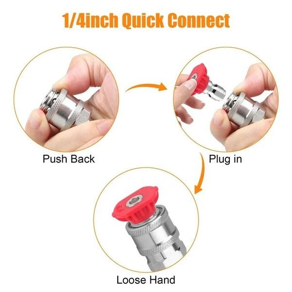 - QUICK CONNECT FITTING: 1/4 inch quick connect snaps onto most residential and commercial pressure washers without tools.