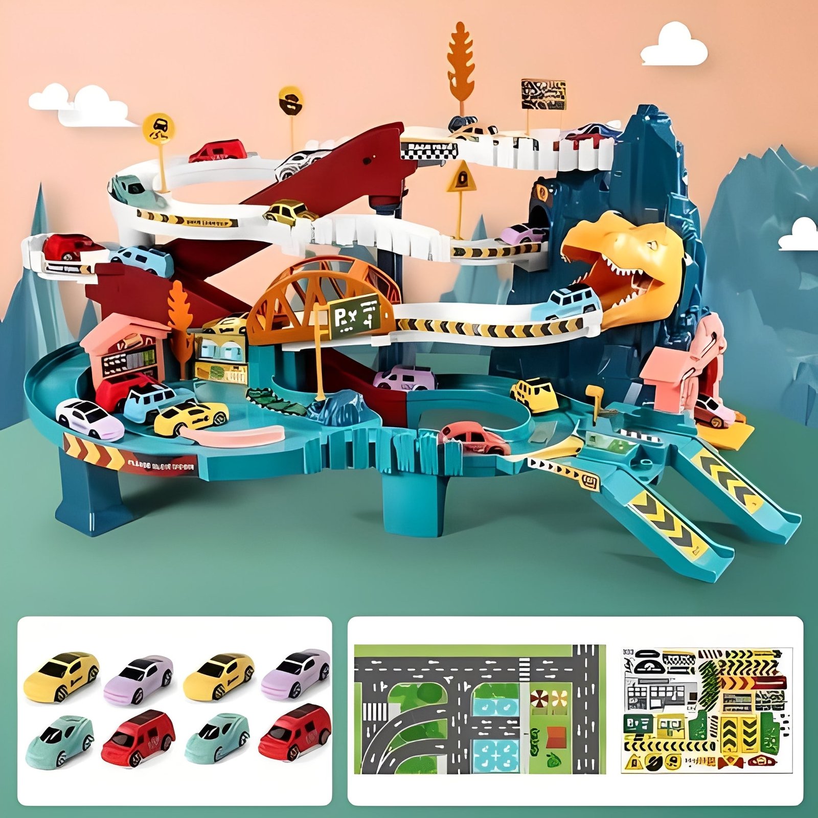 The set requires assembly, offering a hands on construction experience. The track design incorporates traffic and city elements, including tunnels, parking spots, and road signs. These components function to simulate basic traffic scenarios within the dinosaur setting.