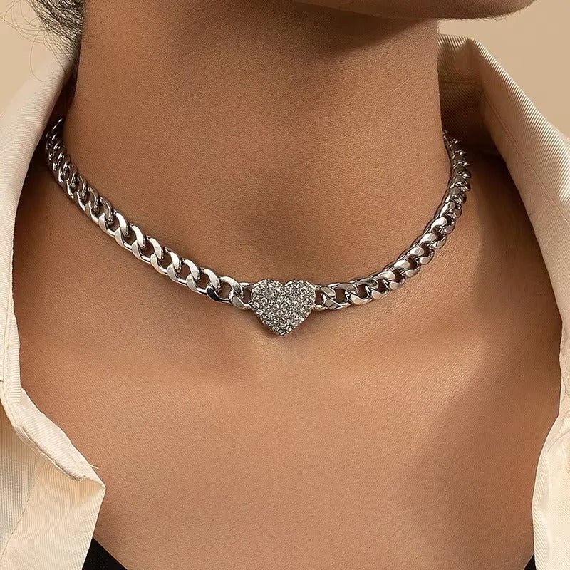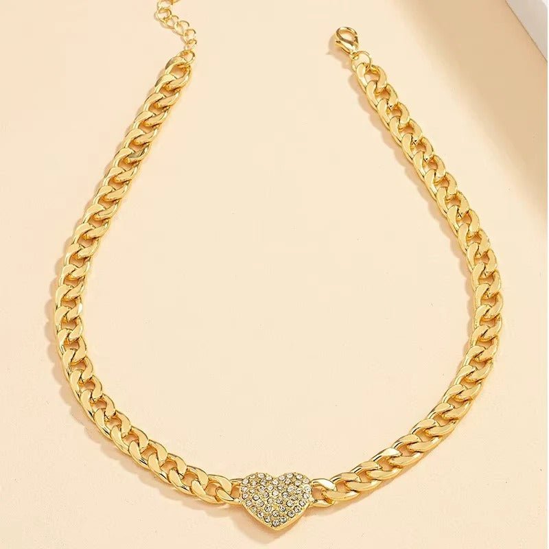 The necklace features a Cuban-style chain paired with a heart-shaped charm detailed with crystal accents. The design is intended to provide a balanced visual element without overpowering an outfit. Available in both silver- and gold-tone finishes, it offers flexible styling options to suit different wardrobes and occasions.