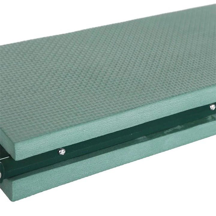 This kneeler uses an elevated padded surface that keeps your knees off the ground while you work. The cushion sits about 8 inches (20 cm) high so you’re not bending as far down or pressing directly into dirt. The steel frame construction holds up to 330 pounds (150 kg) and flips over to become a low seat effortlessly.