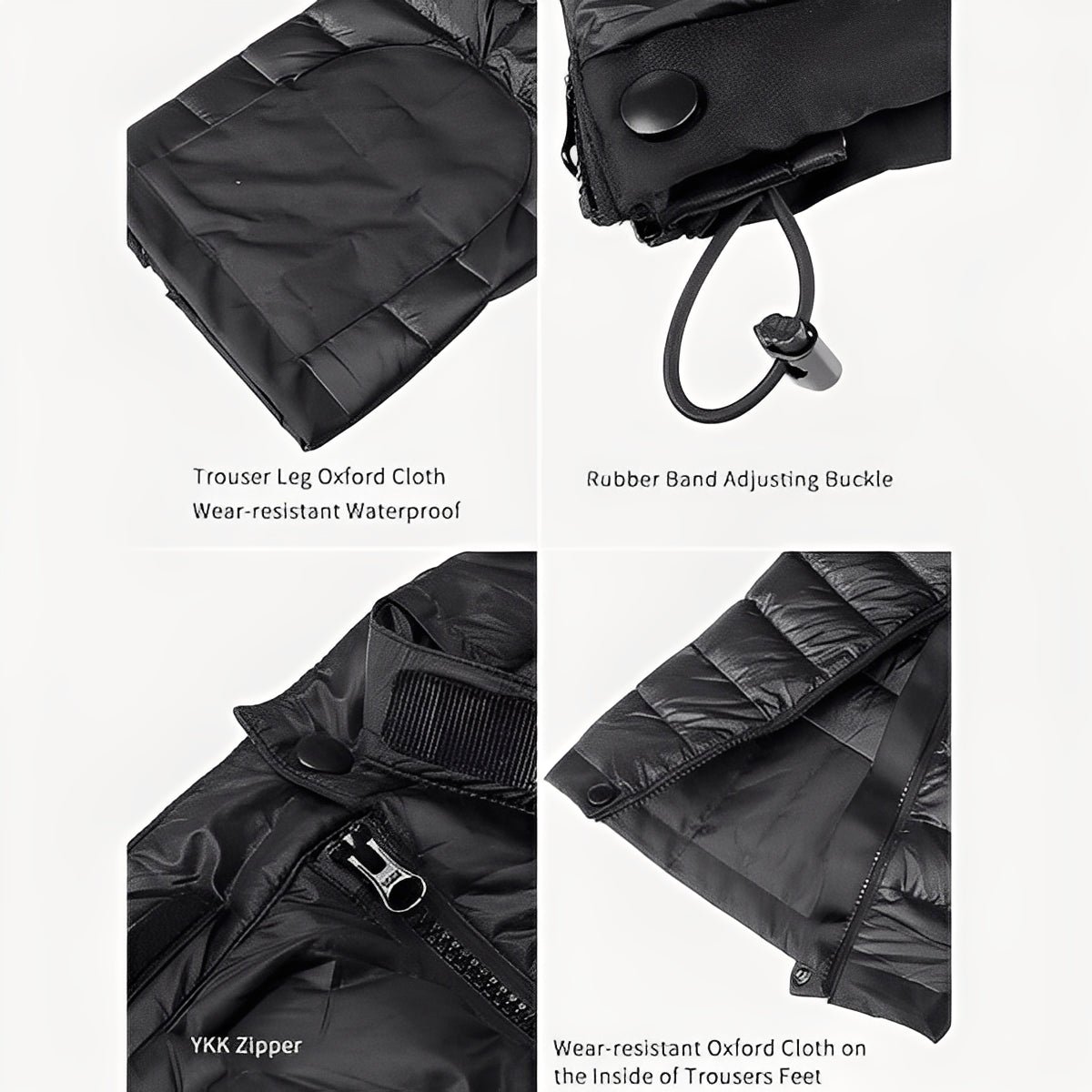 Both legs include long side zippers designed to help users put the pants on or take them off without removing footwear. The exterior uses Oxford fabric that is described as wear-resistant and water-resistant, though performance can differ by environment. The waist features a Velcro adjustment to support a customizable fit.