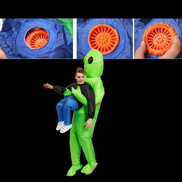 This inflatable alien costume is designed to create a fun visual effect that appears as if an alien is carrying a person. The playful structure may help add humor and visual interest at themed events, costume parties, or seasonal celebrations such as Halloween. Reactions and visual effect may vary depending on lighting, inflation level, and movement.