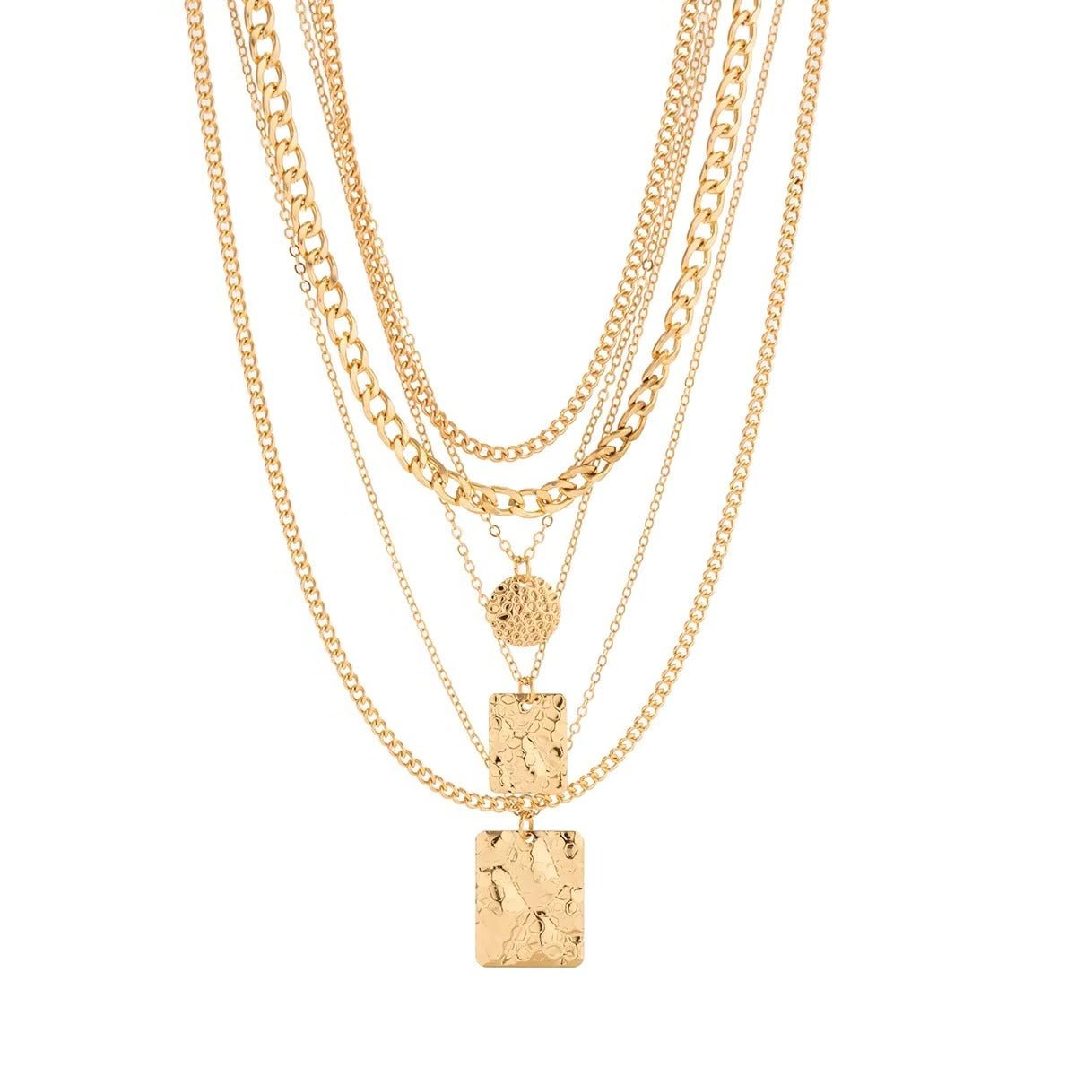 Each necklace is made with metal links and features decorative pendants with a vintage-inspired appearance. Pendant shapes include coin, tag, and square designs. The gold-tone finish is intended to provide a consistent look across all pieces. Visual appearance and finish may vary slightly depending on lighting and use.