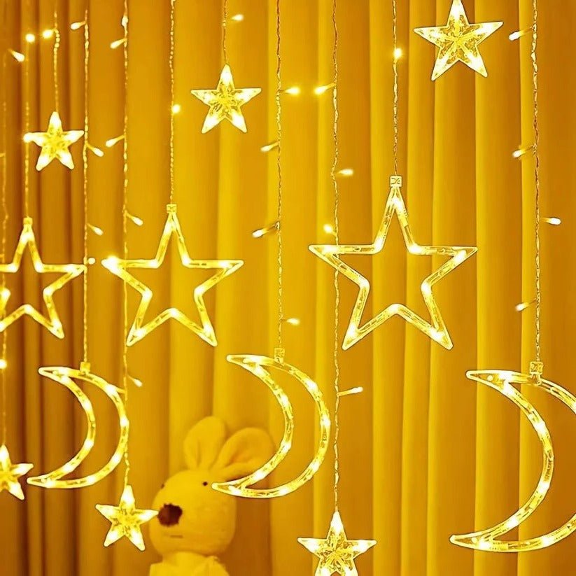 - TWELVE DROP CURTAIN DESIGN: Features twelve hanging strands with nine star shapes and three moon shapes glowing in warm white for a layered, decorative display.