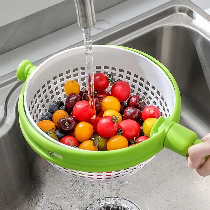 This salad bowl is designed for washing, draining, and drying vegetables and fruits. Its dual-function setup combines a colander and a spinner into a single tool, which can help with meal preparation and may assist keeping your kitchen organized.