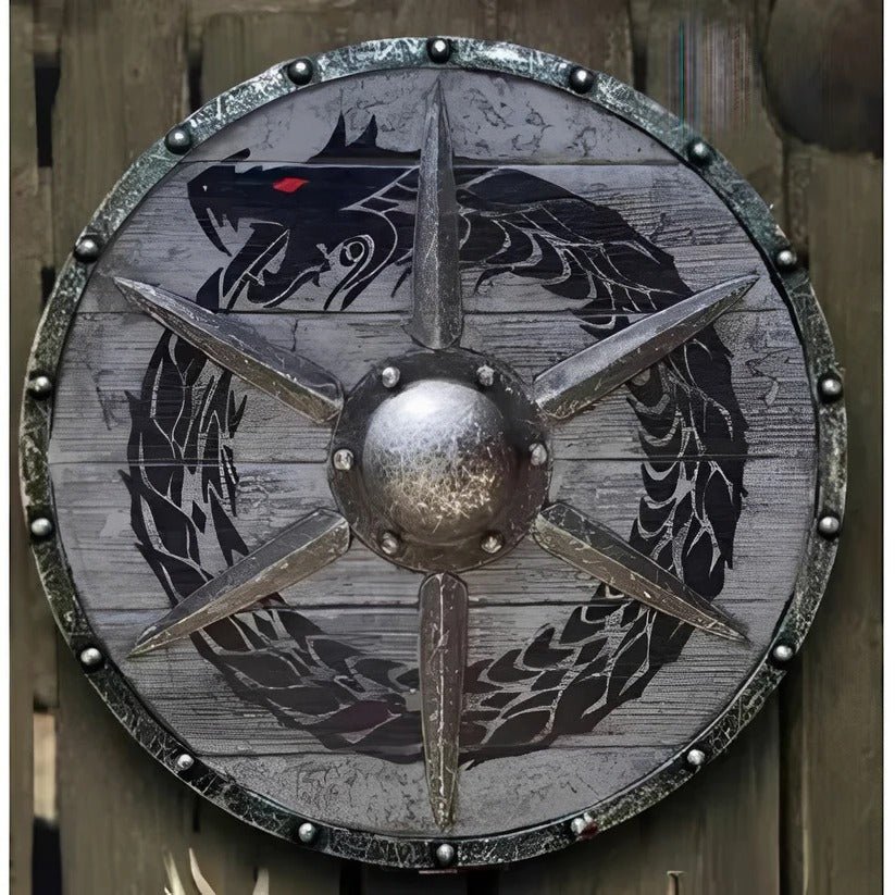 The shield measures 12 inches across and 0.6 inches thick with solid wood construction throughout. The distressed finish and design give it an aged battle worn appearance. The compact buckler size makes it easy to maneuver and carry for extended periods.