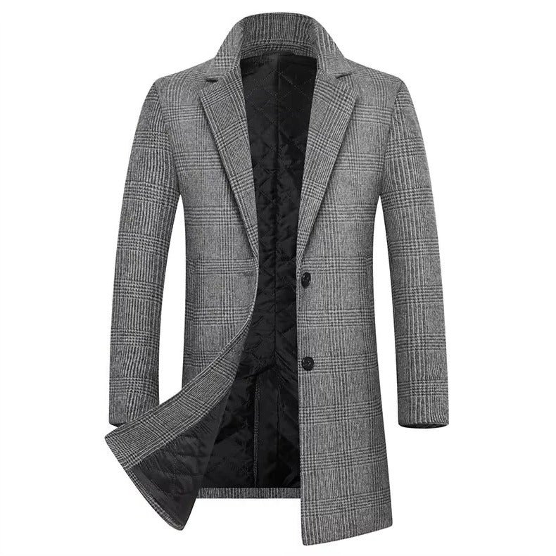 Men’s Plaid Wool Coat with Cotton Padding and Lapel Collar