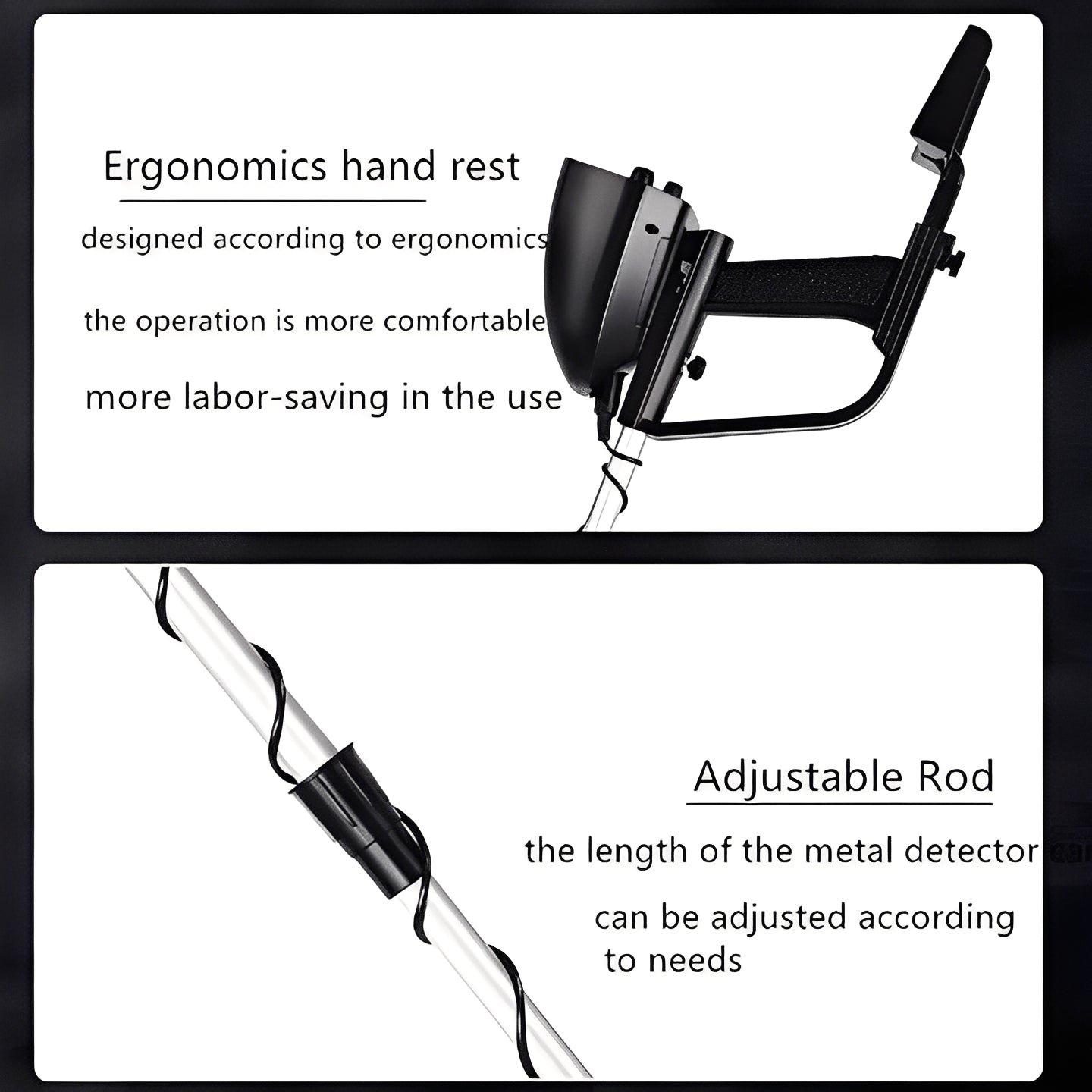 The detector includes an arm support and handle designed to support handheld use during longer sessions. Audio feedback is available through a built-in speaker, with a headphone jack for optional private listening. An LCD indicator provides basic status information, including a low-power alert. Comfort and usability may vary based on user preference and duration of use.