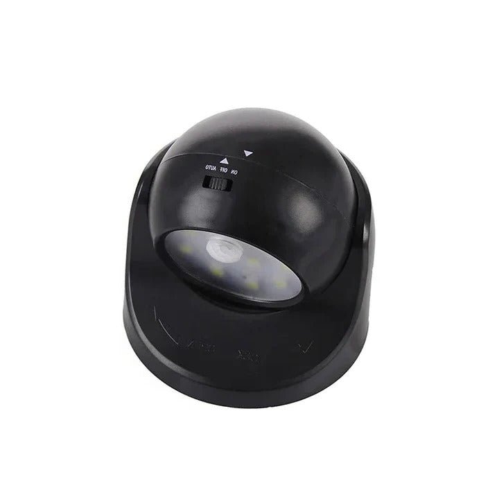 The motion sensor detects movement and triggers the light automatically in low light conditions. You mount the base wherever you need coverage and rotate the head 360 degrees to aim the beam. Batteries power the unit so no wiring or outlet connection is required.
