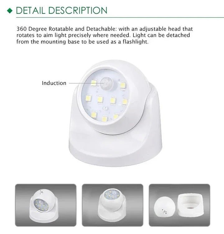 The motion sensor detects movement and triggers the light automatically in low light conditions. You mount the base wherever you need coverage and rotate the head 360 degrees to aim the beam. Batteries power the unit so no wiring or outlet connection is required.