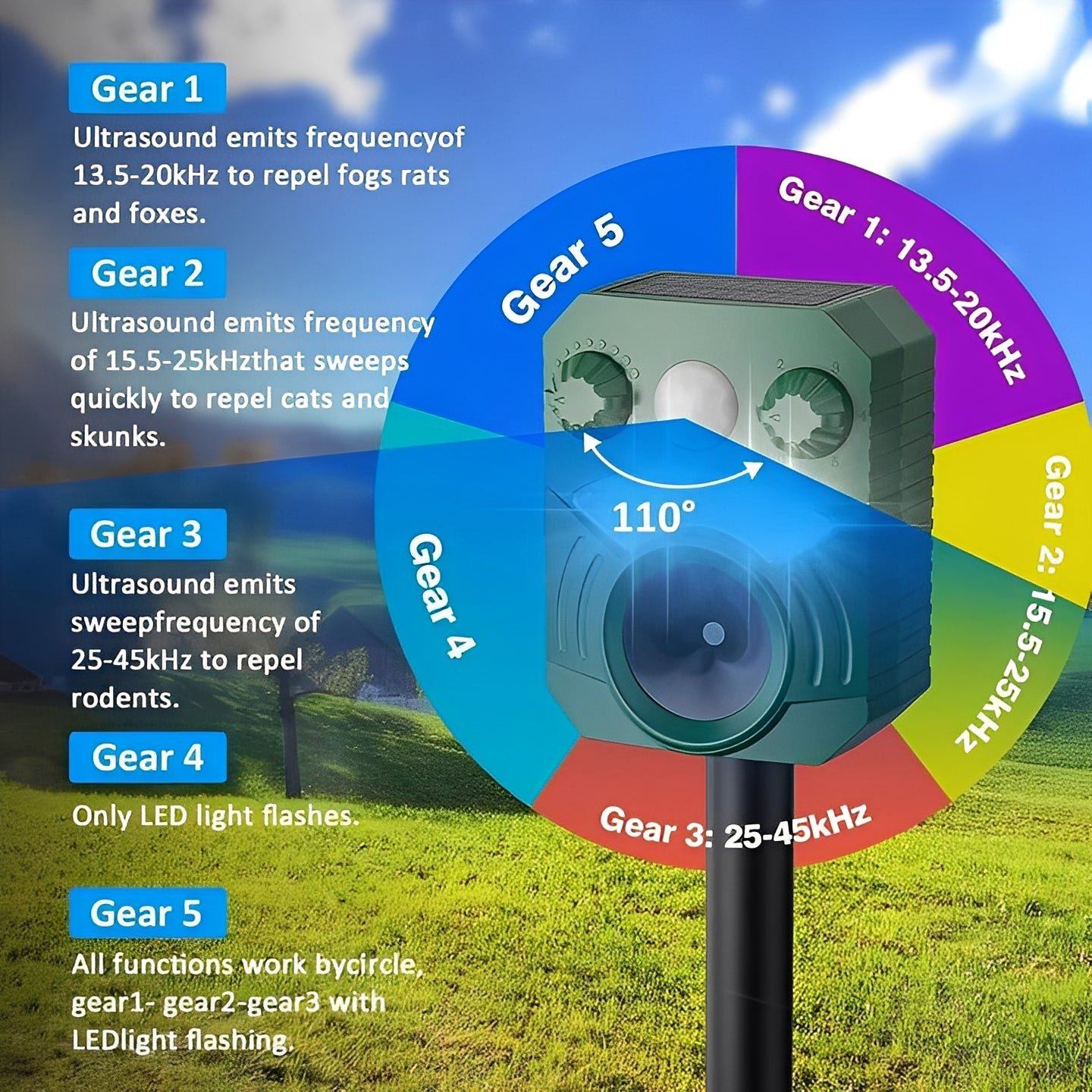 The device is made from ABS plastic and is designed to withstand typical outdoor conditions. It includes five selectable ultrasonic frequency modes, allowing you to choose settings intended for different types of animals that may enter the yard. Effectiveness can vary based on environmental factors.