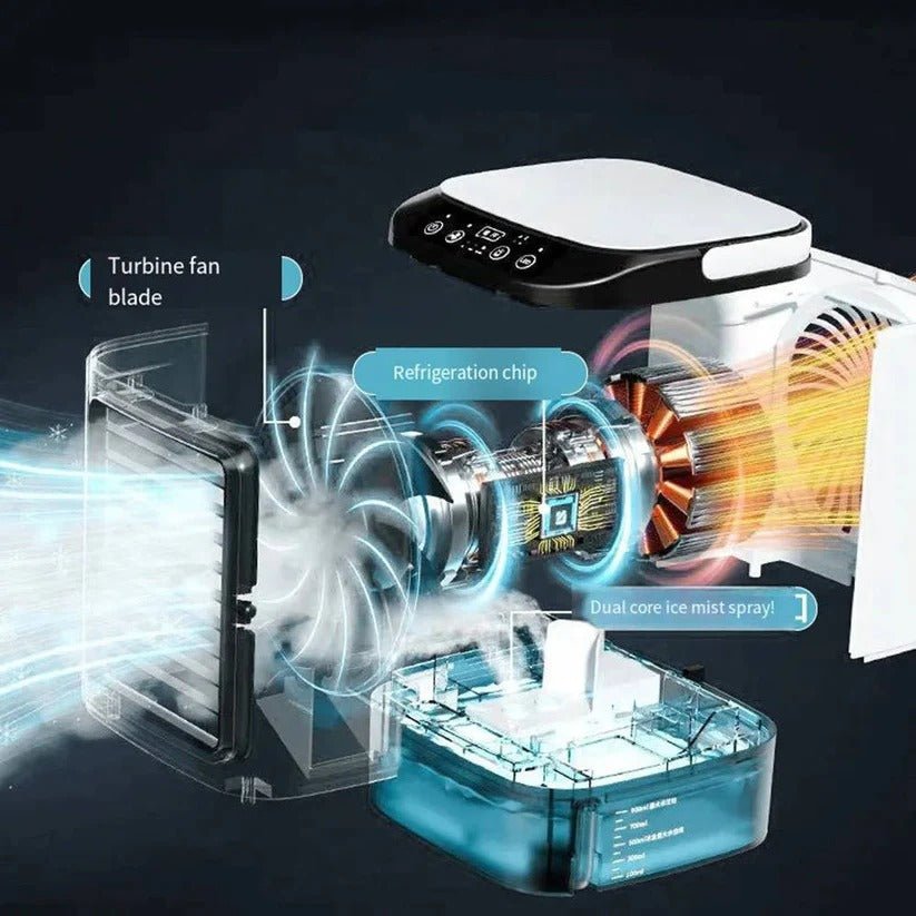 The included ice box freezes in a standard freezer and drops directly into the water tank before use, which lowers the temperature of the water and produces stronger cooler mist output on particularly warm or hot days.