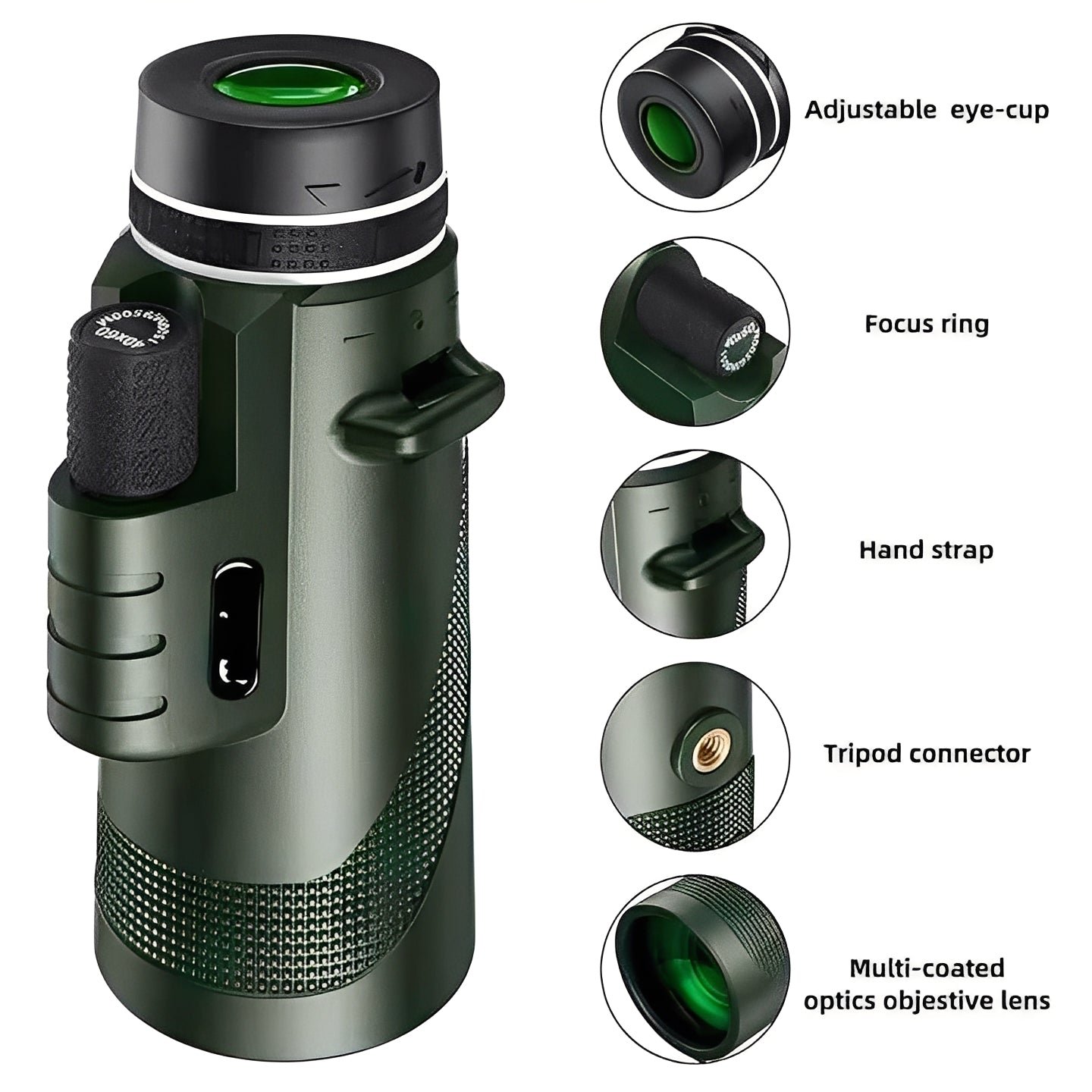 The monocular includes an internal multi-layer lens system. It is constructed for outdoor portability. The build is suited for landscape viewing, stationary wildlife observation, or other visual tasks where long-range focus is desired.