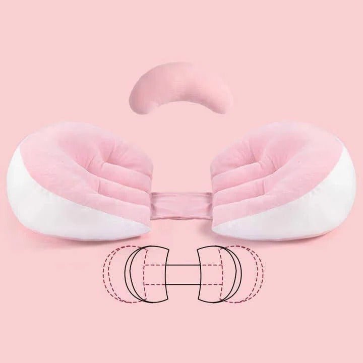 The wedge section tucks under your belly while the curved section wraps behind your lower back at the same time. A bonus cushion slots between your knees or behind your neck wherever you need extra support. Once everything is in place it stays there through the night even when you shift positions.