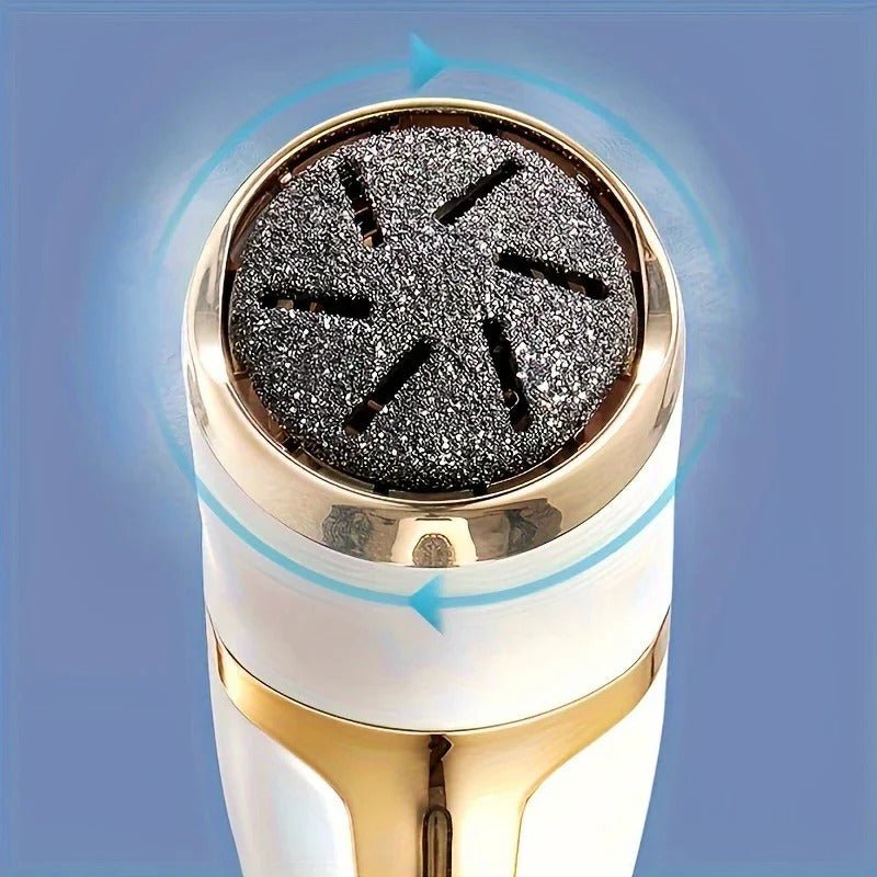 This electric foot file is designed for personal grooming use on foot skin. It operates using a rotating roller head powered by a rechargeable battery. The device is cordless and intended for use in general at-home care routines. Results and experience may vary depending on usage method and individual conditions.