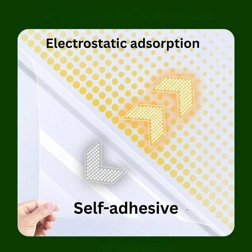 • STATIC CLING HOLD: Clings to smooth surfaces through static alone without any glue, tape, or adhesive of any kind.