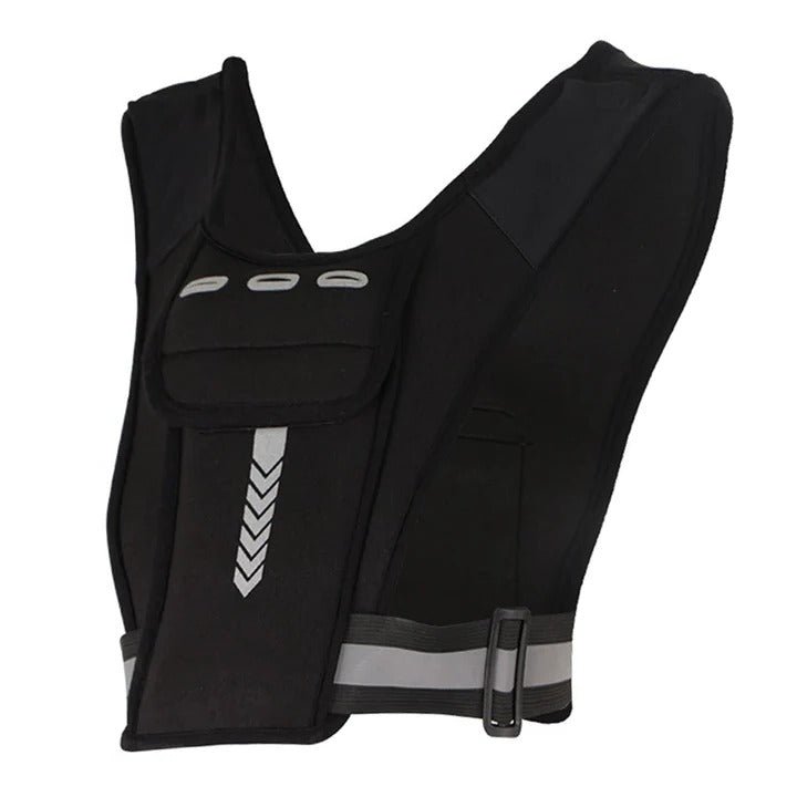 The vest includes reflective-style detailing intended to increase visual contrast in low-light environments. Multiple compartments are incorporated for organizing items such as cards, keys, or small accessories. A rear strap is included for holding a cylindrical item such as a bottle. Actual use and suitability vary by activity and setup.