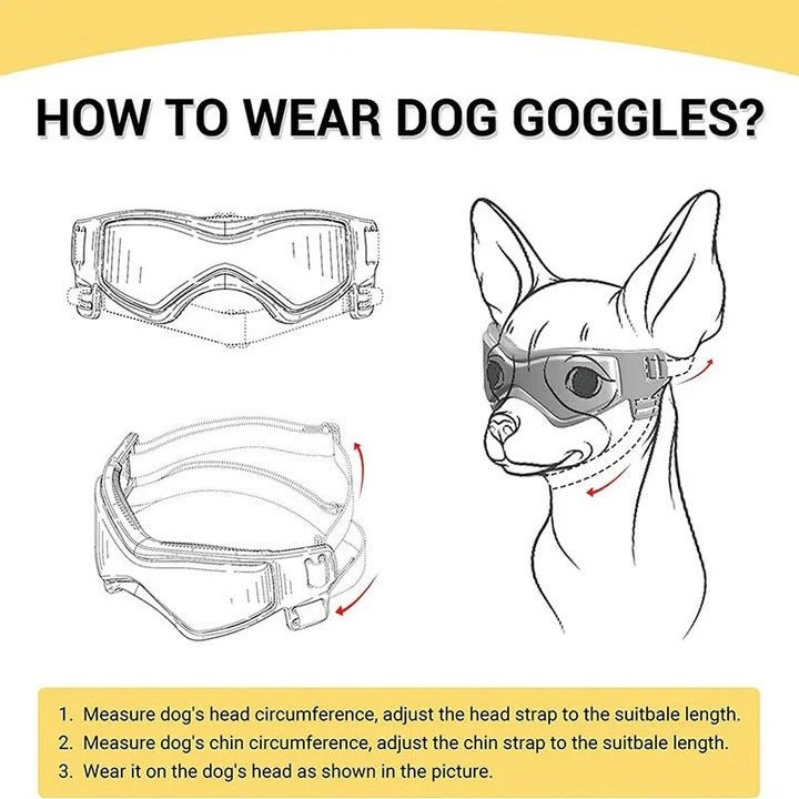 The goggles fit over your dog’s snout with curved lenses that shield their eyes from direct wind. Flexible rubber around the edges molds to their face shape without creating pressure spots that cause discomfort. Adjustable straps wrap around their head and under their chin to hold the goggles steady during movement.