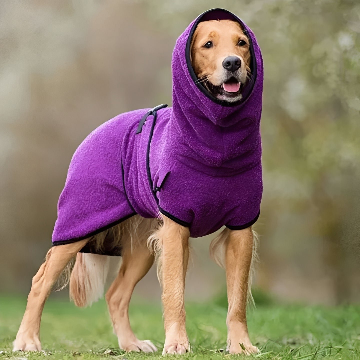 The inner fleece layer help traps their body heat against their skin. The outer shell blocks wind and water from soaking through to their fur. Two hook and loop straps wrap around the neck and belly to help hold snug and sealed.